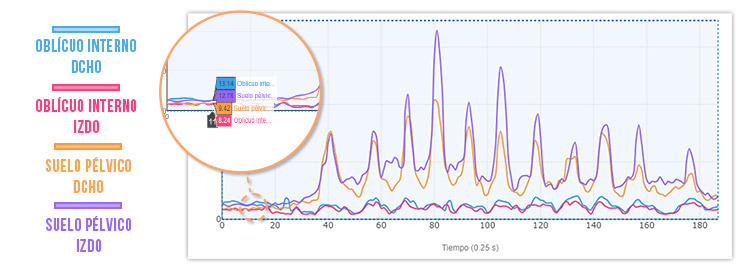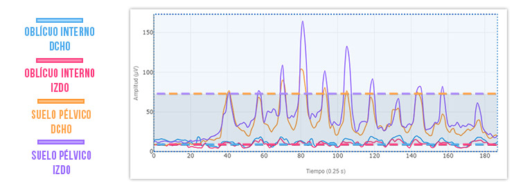 Durante las sucesivas repeticiones de peso muerto, la actividad de la musculatura de suelo pélvico de Sofía es muy superior a la de los oblicuos abdominales.
