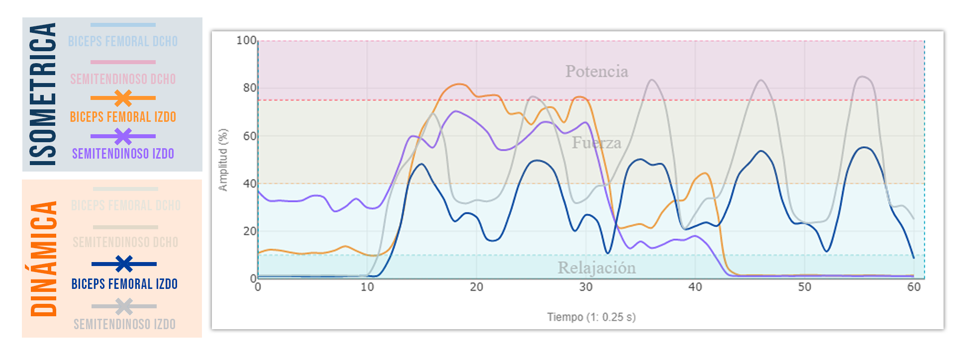 Si comparas la intensidad de la actividad muscular de ambos isquios observarás que es muy similar.