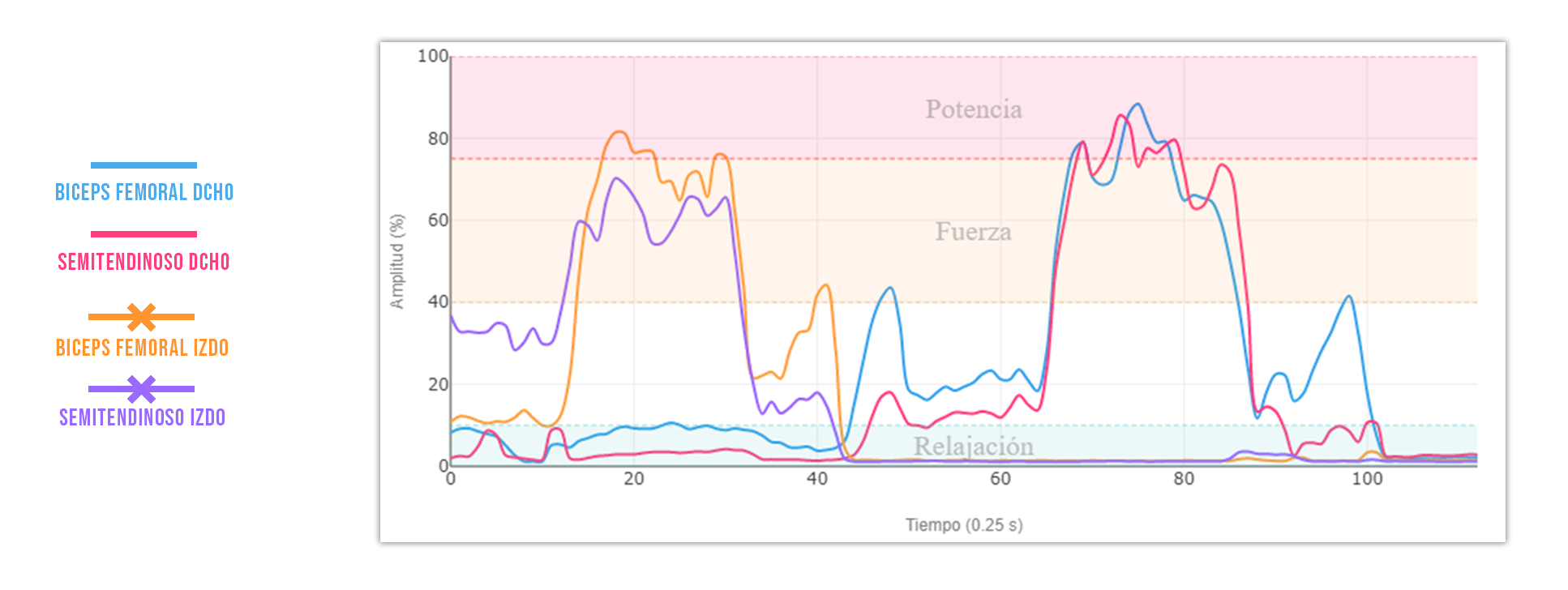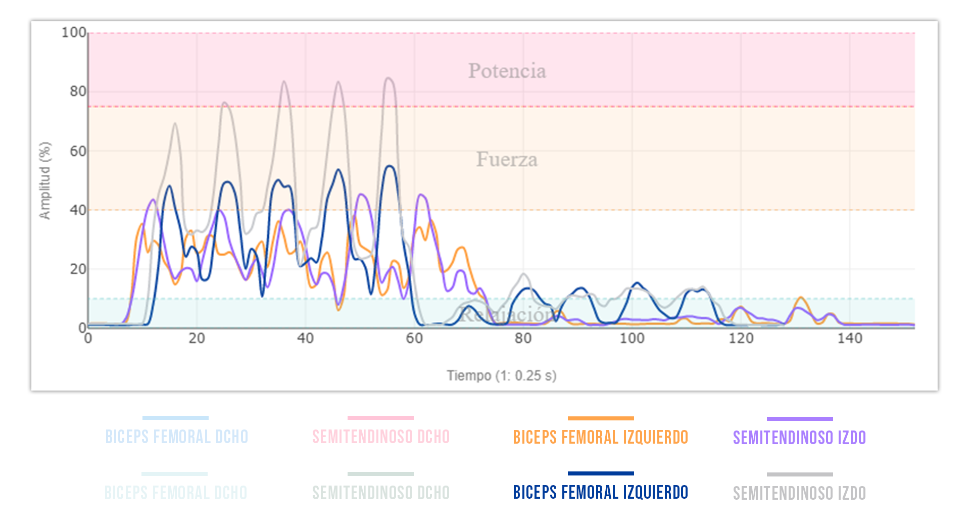 Si comparas la intensidad de la actividad muscular de ambos isquios observarás que es muy similar.