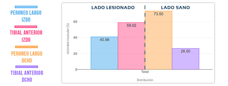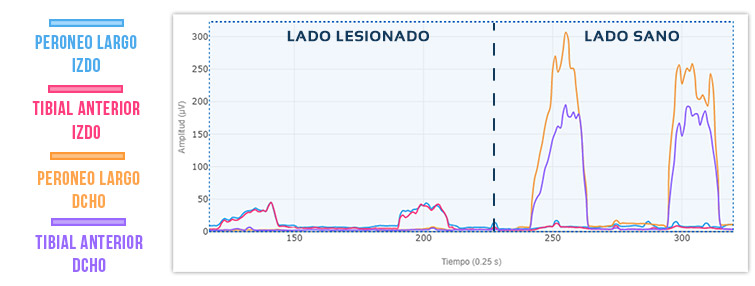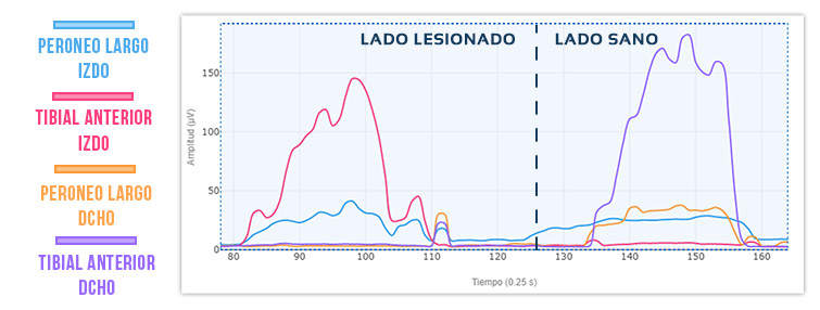 Se puede comprobar en el lado sano cómo la sinergia normal esperada es mayor activación del peroneo que del tibial.