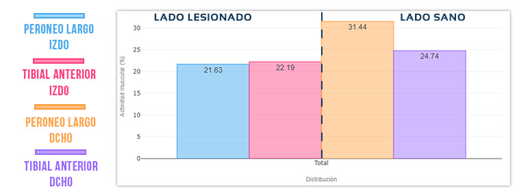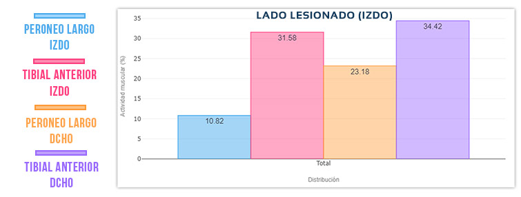 - La actividad EMG del peroneo lesionado es muy inferior a la del peroneo del lado sano (menos de la mitad). El peroneo lateral largo izquierdo presenta, por tanto un déficit de activación.