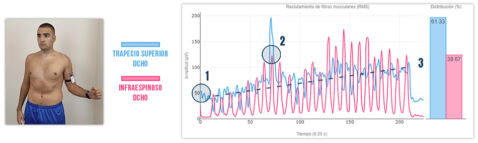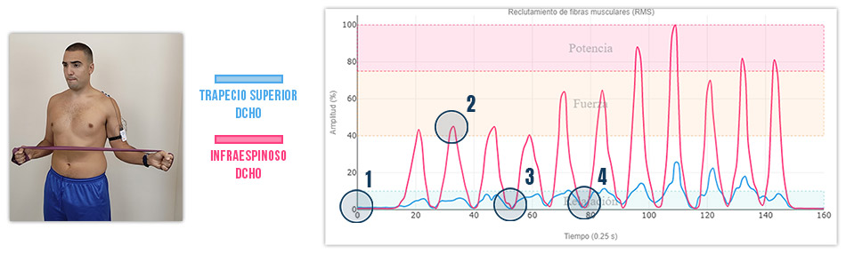 2.-Trapecio superior > Infraespinoso durante algunas repeticiones (no cumple la sinergia) (X roja).