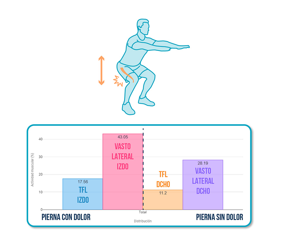 Le pedimos a Martín que realizara una serie de sentadillas. Colocamos los electrodos en el glúteo medio, TFL y vasto lateral. Al revisar los datos, lo tuvimos claro: