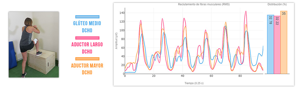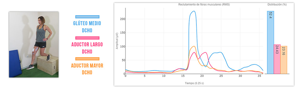 En todas estas pruebas, apoyo monopodal, subir y bajar escaleras, step up, aterrizajes, la sinergia esperada entre el glúteo medio y los aductores es esta:
