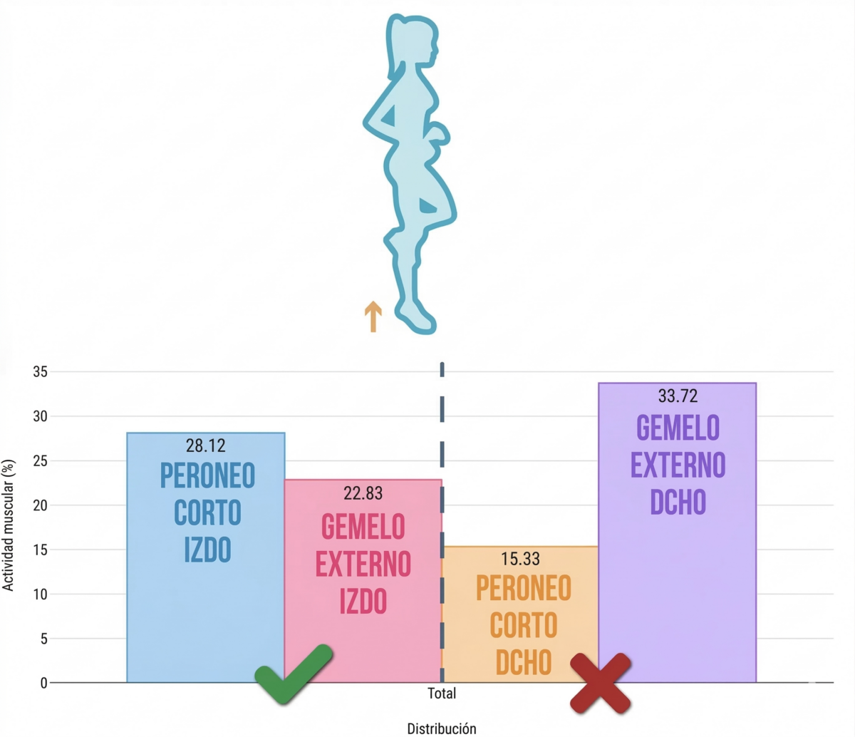 Aquí aparece el primer hallazgo relevante: el peroneo corto derecho muestra un déficit de activación, acompañado de una menor participación del gemelo externo. Esto indica que el sistema neuromuscular no está generando la respuesta adecuada para estabilizar el tobillo durante la carga.