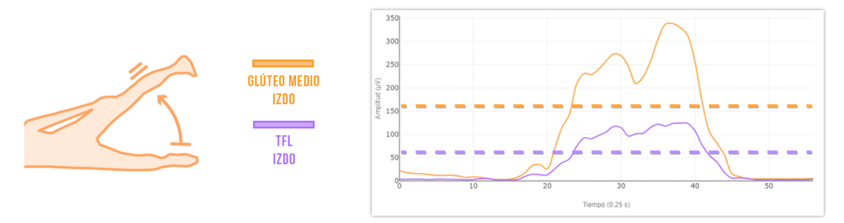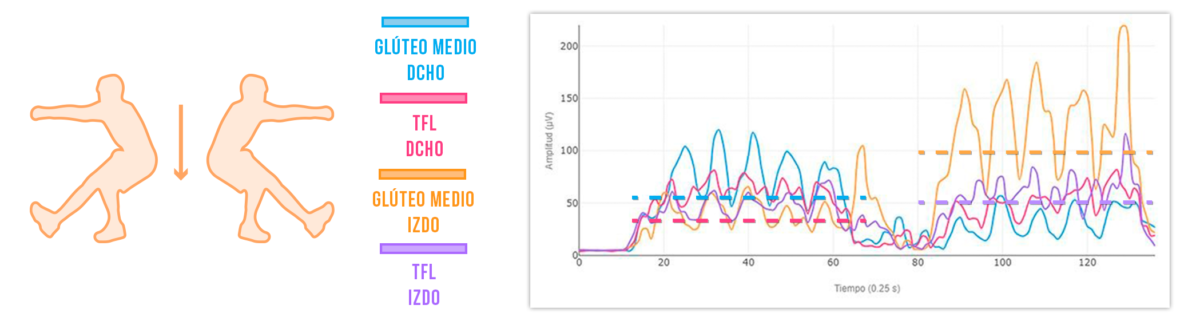 De nuevo puedes observar como el glúteo medio derecho, aunque tiene mayor activación que el TFL, sigue alcanzando valores que apenas representan la mitad de la activación del glúteo medio izquierdo.