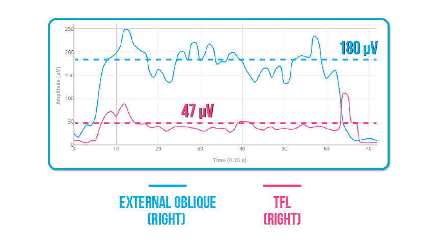 Conclusion: The external oblique is highly engaged, while the TFL activation remains moderate.