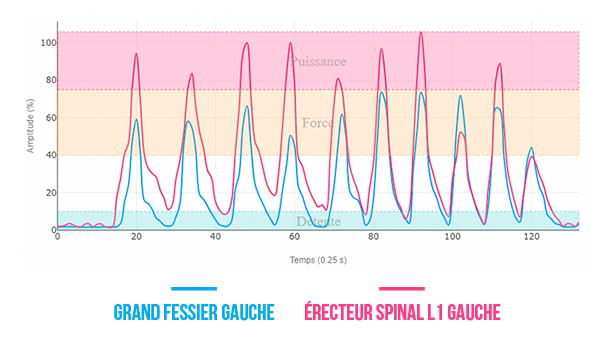 Cependant, regardez ce qui se passe quand il le fait. Il s’avère que son grand fessier s’active davantage mais les muscles de son dos ont une coactivation plus importante. Cela aggrave sa synergie lombo-pelvienne ! Par conséquent, si vous ne vous obsédez pas à personnaliser et mesurer, vous ne contrôlez pas ce que vous faites.