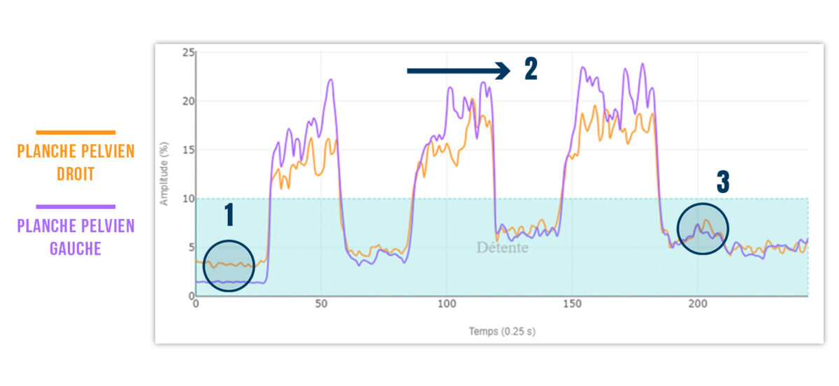 - 3. À la fin de chaque contraction, le ton des deux côtés revient au seuil de relaxation.