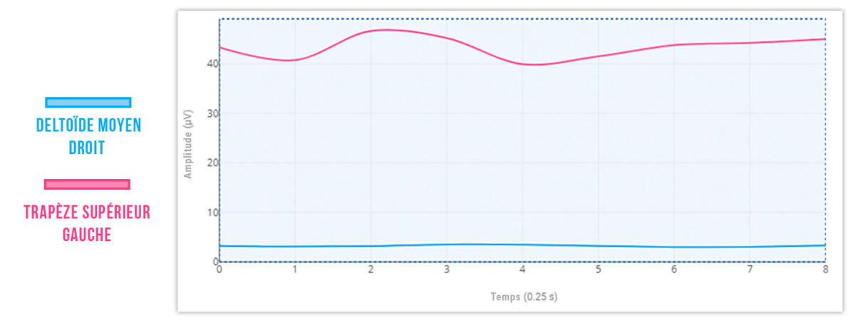 Le trapèze supérieur du côté douloureux, le droit, nécessite plus d’activité musculaire pour exécuter cette tâche. Cette altération du tonus basal conduit à une fatigue musculaire et peut induire de la douleur.
