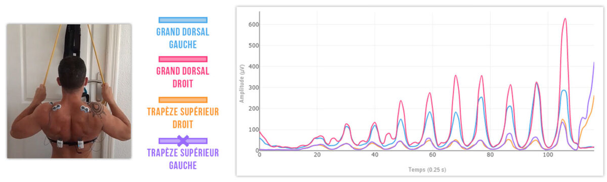 D’autre part, si vous observez le côté gauche, vous verrez que le trapèze supérieur génère plus d’activité que le grand dorsal dès la quatrième répétition. Cela correspond à l’épaule présentant le plus de symptômes.