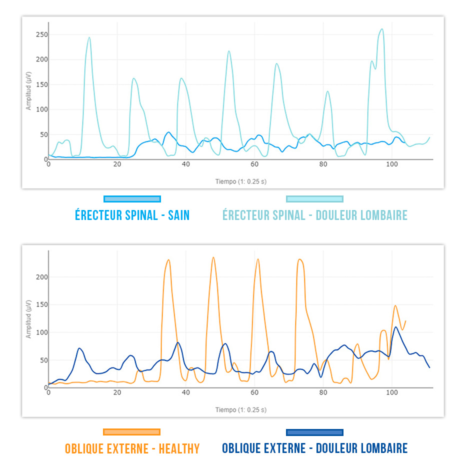 ❌ L’érecteur spinal gauche s’active 3 fois moins que chez une personne en bonne santé → Instabilité et compensations possibles.