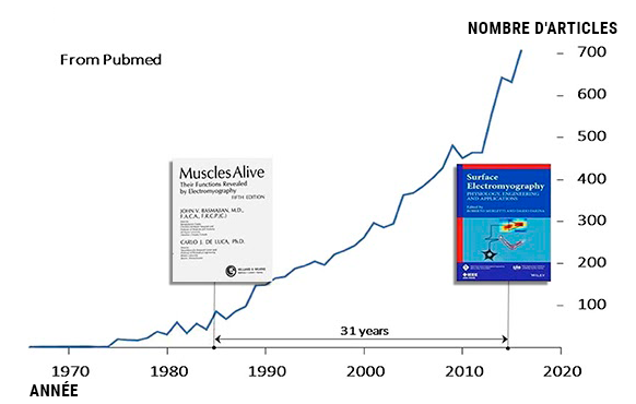 Jetez un œil au nombre d’articles publiés chaque année sur l’électromyographie de surface.