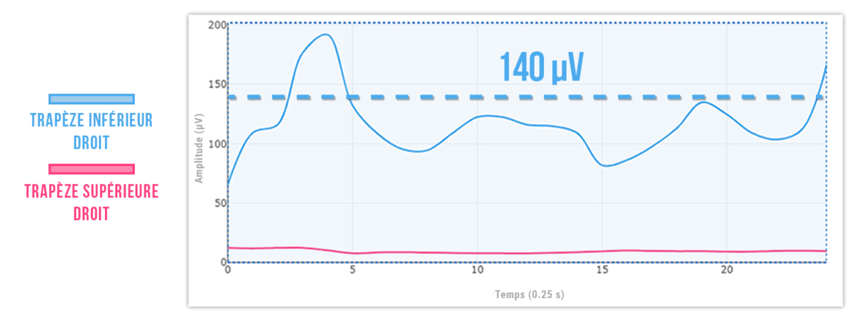 En position debout, le trapèze inférieur droit montre une activité 14 fois supérieure à celle du trapèze supérieur droit, alors qu’il devrait normalement être au repos.