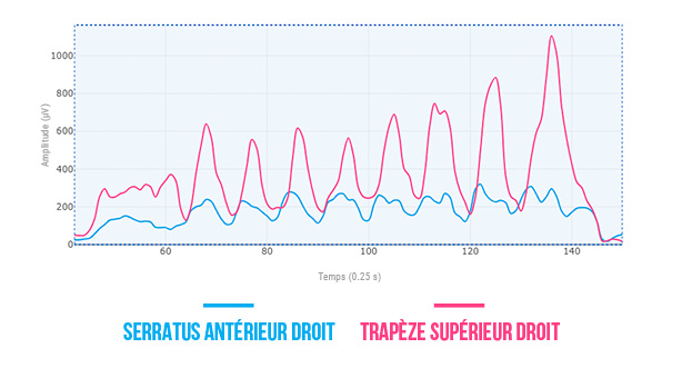 De plus, notez comment l’activité musculaire du trapèze supérieur augmente à mesure que les répétitions avancent. Cela peut s’expliquer par l’accumulation de fatigue musculaire due aux élévations répétitives des épaules.