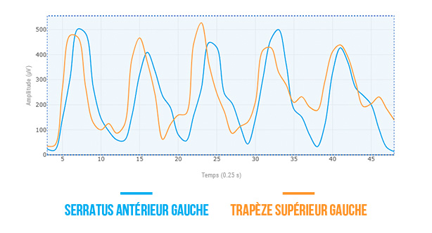Dans le graphique, vous pouvez facilement observer comment le patient présentant une douleur à l’épaule du bras gauche a une activité excessive du trapèze supérieur par rapport au dentelé.