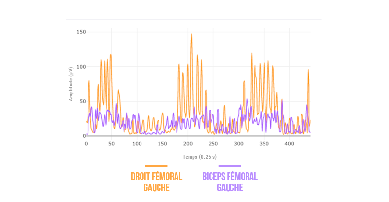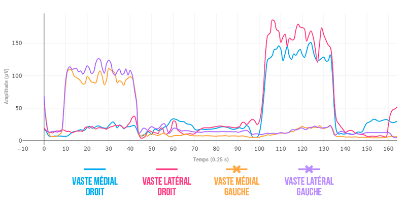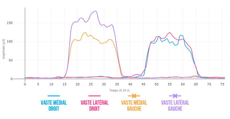Si vous analysez l’activité musculaire de chacun d’eux, vous avez d’abord un cas où si vous comparez l’activité du vaste interne et externe de la jambe gauche par rapport à la droite, vous pouvez confirmer une inhibition des muscles de la jambe gauche.