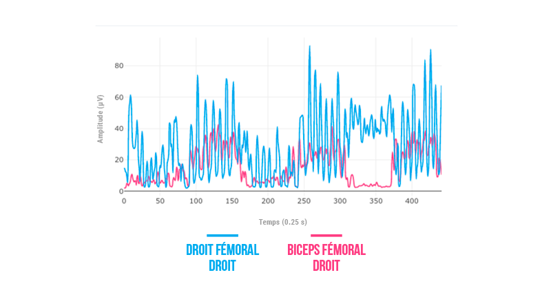 Dans cette image, vous pouvez observer l’activité neuromusculaire d’un joueur de football blessé au LCA, lorsqu’il réalise un exercice de STEP-UP.