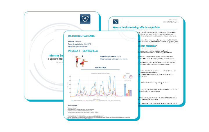 Los informes se generan automáticamente, incluyendo: Gráficas de simetría, comparaciones entre lados, entre sesiones, guías con sinergias esperadas, activaciones máximas y medias por músculo, etc.